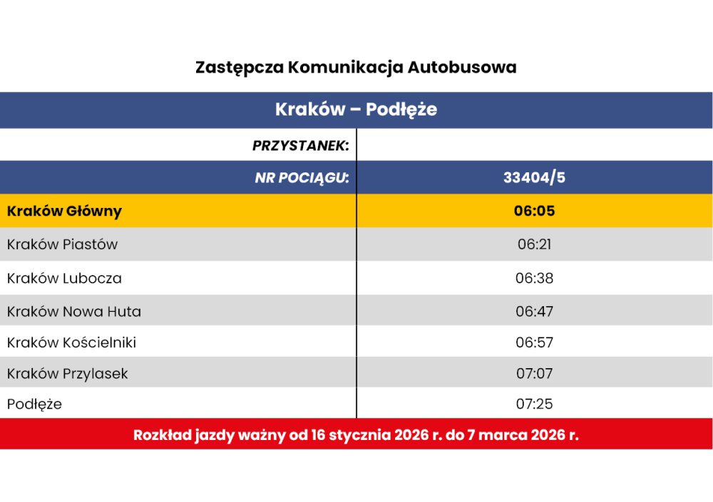 -> w dniach od 16 stycznia 2026 r. do 7 marca 2026 r. na trasie SKA2 na odcinku Kraków Główny - Podłęże