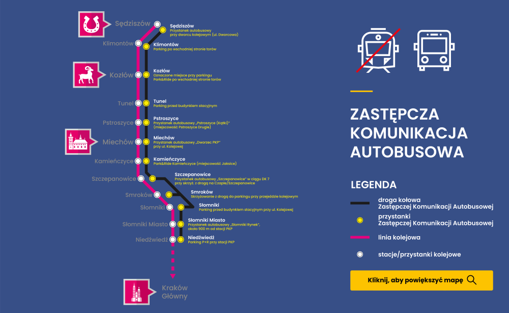 -> w dniach od 16 stycznia 2026 r. do 7 marca 2026 r. na trasie SKA2 na odcinku Sędziszów - Niedźwiedź